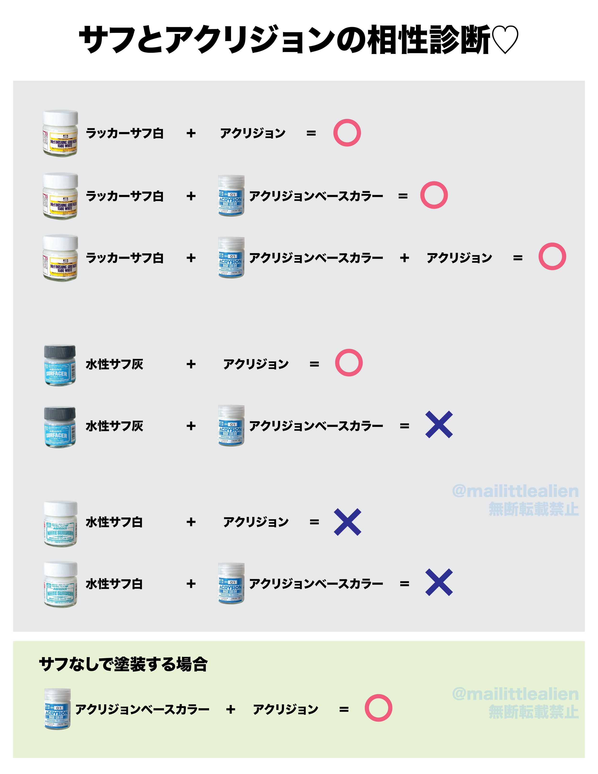 サフとベースカラーとアクリジョンの相性診断(実験結果)をまとめました。